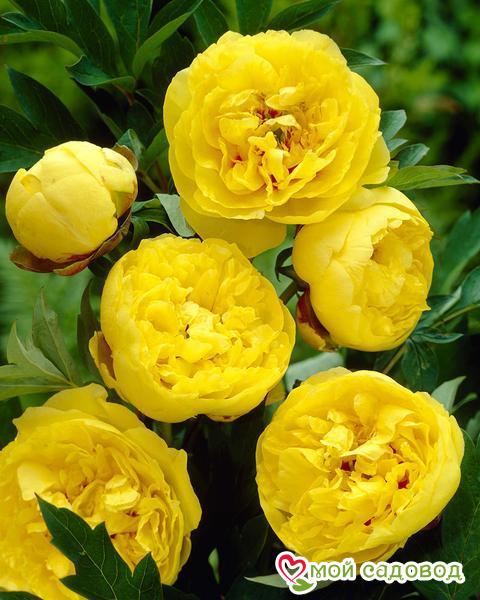 Йеллоу Краун — высота 60 см. Цветок полумахровый или махровый, ярко-жёлтый с несколькими красными метками-всполохами у основания лепестков. Ароматный. Срок цветения средний. Месторасположение: в солнечном, умеренно теплом месте. При посадке почки должны находиться не ниже и не выше 3 — 5 см. от уровня земли. При низкой или высокой посадке пионы не цветут! После пересадки сортовые качества проявляются на 2 — 3 год.