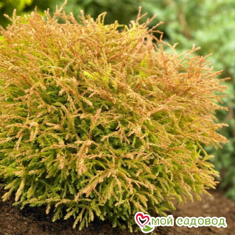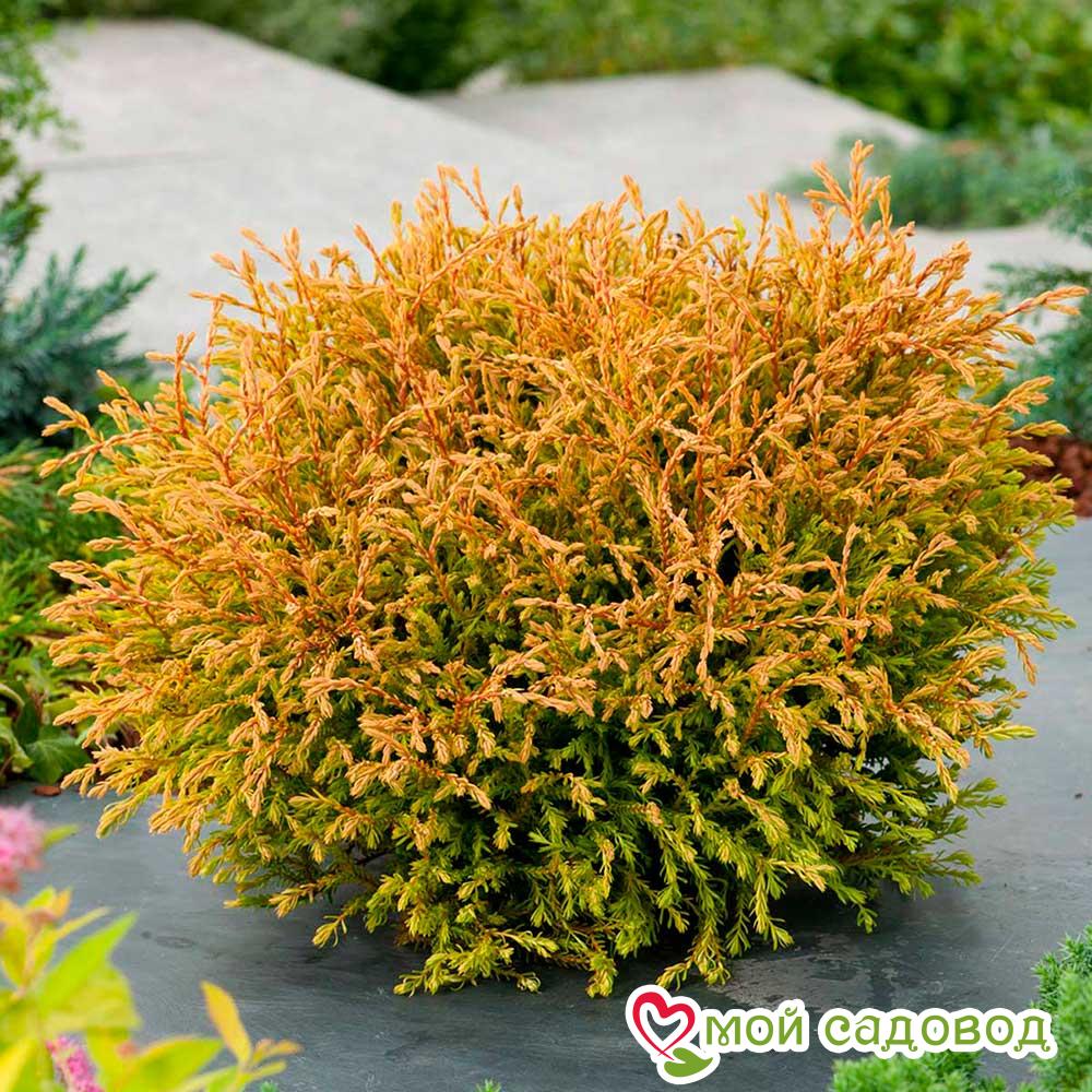 Туя Голден Таффет Данный сорт — декоративная карликовая разновидность западной туи. Слово «tuffet» в переводе с английского языка означает низкий округлый стул. Получен Голден Таффет в 1997 году в питомнике IseliNursery, размещённом в штате Орегон. Ботаническое описание Кустарник сформирован из двусторонних сплюснутых по бокам ветвей. Побеги тонкие, повисающие, короткие и достаточно гибкие. Чешуйчатая хвоя не прижата к веткам. Она выглядит ажурной и состоит из мелких иголок. Особую привлекательность растению придаёт золотисто-жёлтый оттенок. А вот у основания хвоя светло-зелёной окраски. Со временем концы иголок приобретают насыщенно жёлто-оранжевый тон. С приходом зимы он преобразуется в цвет тёмной бронзы. По всей длине хвойные чешуйки покрыты слоем воскового налёта. Голден Таффет — культура медленнорастущая. Годовалый прирост составляет максимум 12 см. По достижению возраста 10 лет диаметр кустарника равен 50 см. Саженцы, которым насчитывается 25 лет, достигают более 1 м в ширину и около 90 см в высоту. Ветви молодых экземпляров покрыты гладкой корой красно-бурого цвета. По мере взросления побегов она приобретает серо-коричневый оттенок. Плодоношение  у туи начинается в 10 лет. На ветках образуются маленькие шишечки длиной до 8 мм. Это очень зимостойкая и теневыносливая культура, выдерживающая заморозки до -34 ºС. Однако иммунитет у Голден Таффет не слишком хороший. Декоративный кустарник подвергается атакам насекомых-вредителей (прежде всего, туевой ложнощитовки). Также растение боится грибковых инфекций. Ранней весной кустарник может пострадать из-за солнечных ожогов. Применение Высаживают туи Голден Таффет в небольших садах в восточном стиле, альпинариях, альпийских горках, на приусадебных участках и газонах (как одиночно, так и группками). Растения активно используются в роли контейнерного растения. Оно подходит для создания живого бордюра или низкорослой изгороди, оформления откосов и склонов, балконов, террас, крыш и лоджий. Такая туя хорошо смотрится в цветочных композициях с другими растениями. Хвойные чешуйки снабжены желёзками с целебным эфирным маслом, насыщенным фитонцидами. Агротехника Голден Таффет предпочитает хорошо освещённые участки. При этом полутень тоже подходит растению. Полностью затенённое место культура не переносит – есть риск потери плотности кроны и потускнения хвои. Рассада благополучно развивается на влажных, рыхлых и плодородных субстратах с уровнем кислотности в пределах 5 − 6 ед. Наиболее удачный вариант – суглинки или супесчаники. Посадку хвойной культуры проводят весной или ранней осенью. Между саженцами, изображёнными на фото каталога, оставляют интервал от 50 см до 3 м. Важно не заглублять корневую шейку — она должна размещаться на уровне грунта. Для полноценного роста рассады и сохранения декоративных свойств кроны необходимо придерживаться основных рекомендаций по уходу: своевременная прополка; проведение умеренных поливов прохладной, мягкой водой; профилактическая обработка ветвей препаратами, содержащими медь; дождевания кроны в засушливый период; ежегодная формирующая и санитарная стрижка кроны; рыхление и укрытие мульчёй почвы вокруг ствола; внесение минеральных подкормок весной и летом. Укрывают Голден Таффет на зиму, только если это молодые саженцы. В качестве теплоизоля