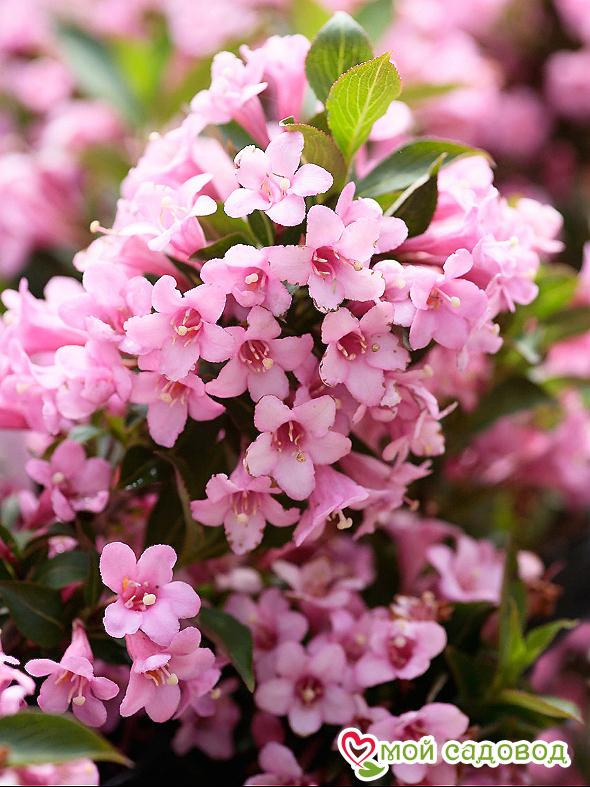 Вейгела Розеа (Weigela florida Rosea) — гибрид между вейгелой цветущей и вейгелой корейской. Раскидистый кустарник до 2м высотой и до 2,5м шириной. Цветки очень крупные с колосовидным отгибом, розовые, слегка пестрят белым, обильно появляются на кусте в июне месяце. Листья светло-зеленого цвета, осенью краснеют. Этот сорт зимует лучше всех других, ему требуется лишь небольшое укрытие листом. Любит солнечные места, плодородные дренированные почвы. Уход за растением: Саженцы вейгелы нужно сажать в плодородную, воздухопроницаемую почву. Сразу учитывайте, что место постоянное, так как пересадить массивный куст с пышной кроной даже при желании будет практически невозможно. Для того, чтобы растение выглядело аккуратно, его нужно стричь, удаляя больные и поврежденные ветки и формируя крону так, как вам это нужно. В первый сезон кустарник нуждается в регулярном поливе, затем вейгелу поливают только при длительных засухах.